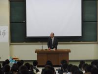 4月7日、伊都キャンパスの椎木講堂で、平成27年度入学式が行われた後、4月9日に箱崎キャンパス大講義室にて経済学部オリエンテーションが開催されました。オリエンテーションでは貫正義同窓会長にお越しいただき、同窓会の説明と入会案内を行っていただきました。