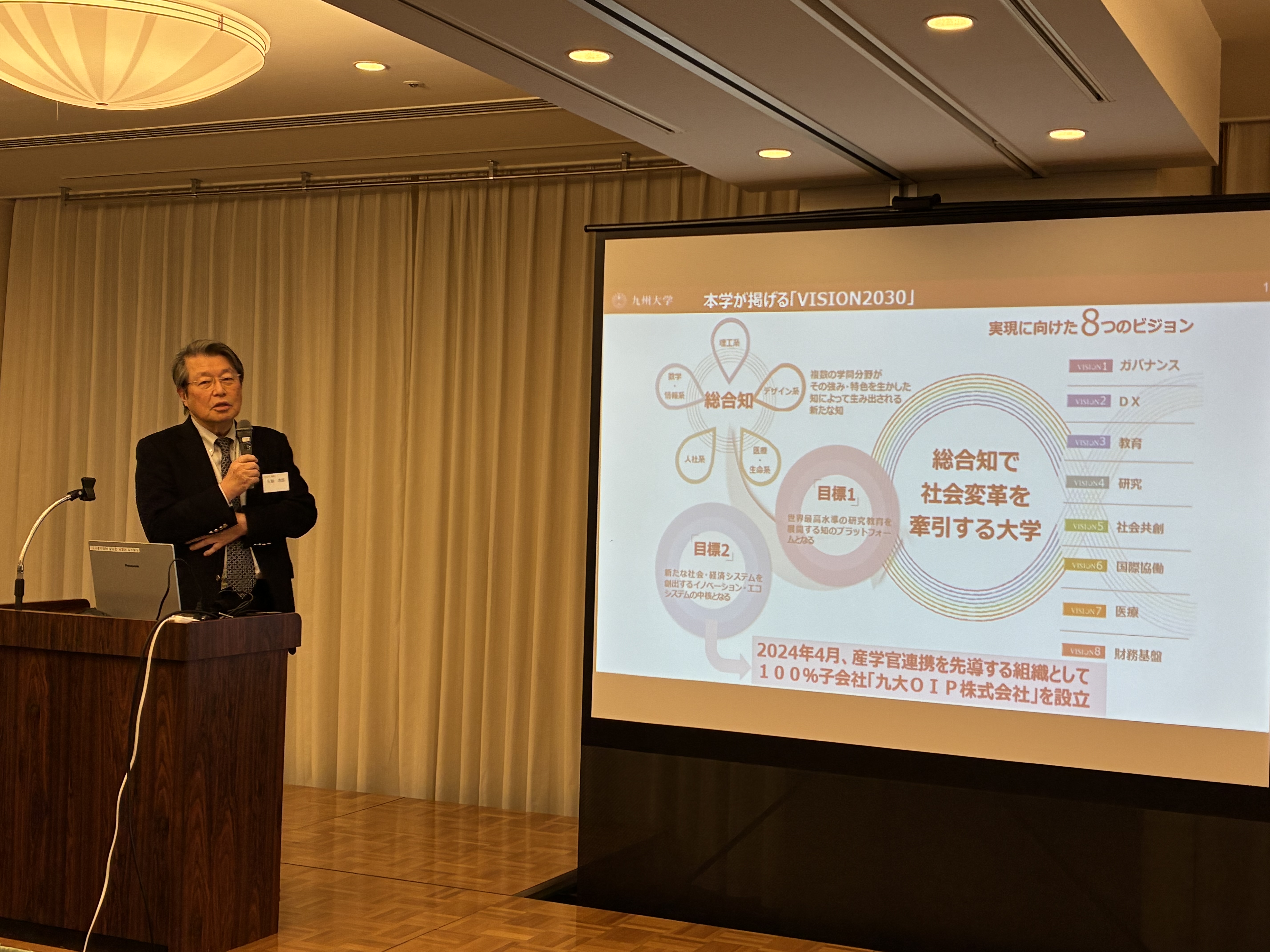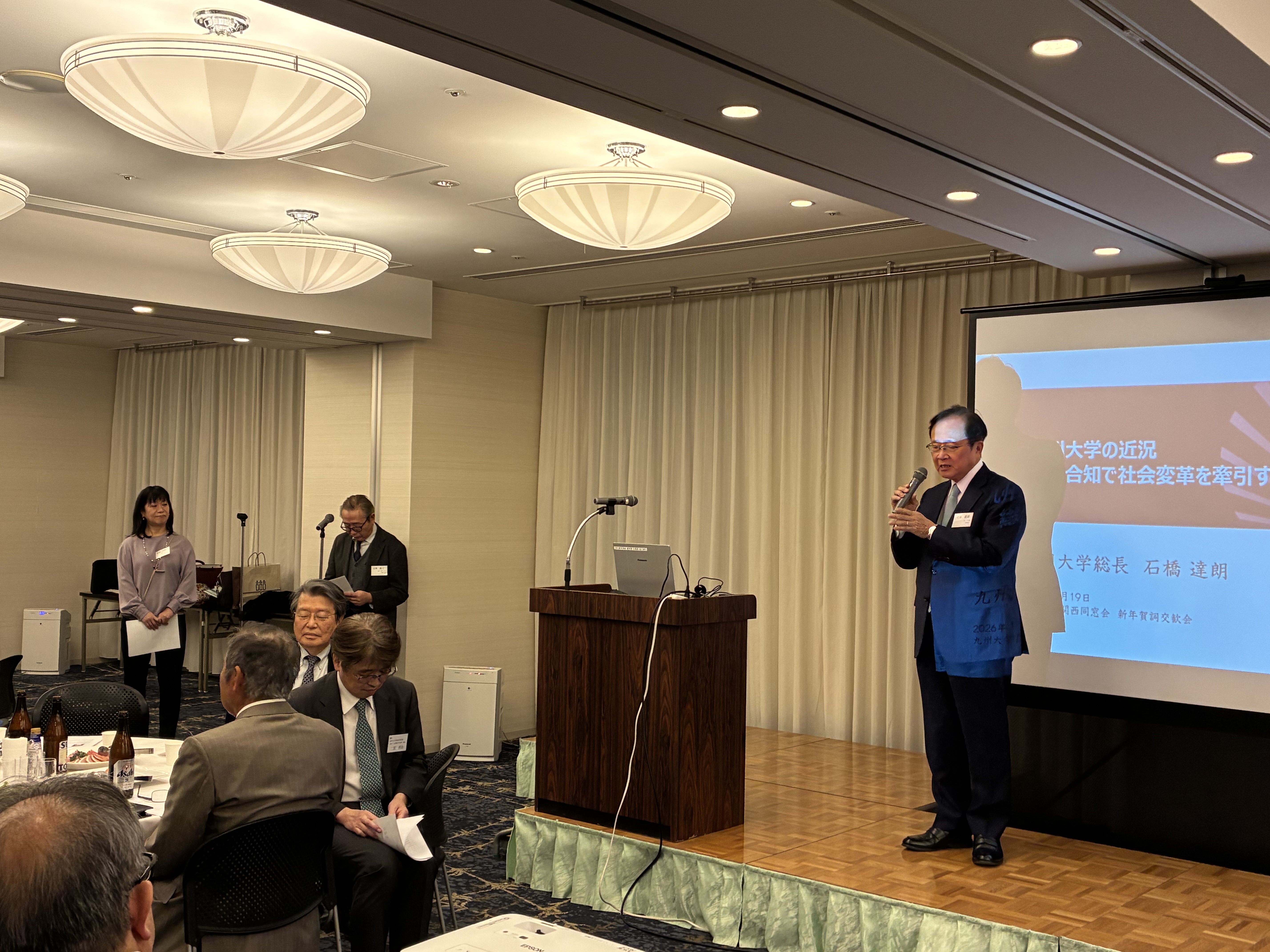 また、賀詞交歓会(懇親会)では、昨年7月の総会で関西同窓会長に就任された佐藤義雄氏(住友生命保険・特別顧問)の挨拶の後、石橋総長から九大が現在取り組んでいる様々な活動についてお話を伺いました。続いて顧問の佐藤廣士氏(神戸製鋼所・顧問)のご発声による乾杯で懇談・食事会が始まり、参加者のスピーチ等であっという間に時間となり、最後は九大応援団OBの主導による学生歌「松原に」を斉唱し、お開きとなりました。