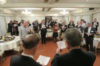 懇親会も大詰めを迎える頃、中尾氏、金子氏の演奏と藤丸理事(昭和35年法学部卒)と高口理事(昭和41年経済学部卒)のリードで、学友歌「松原に」を全員で声高らかに合唱しました。