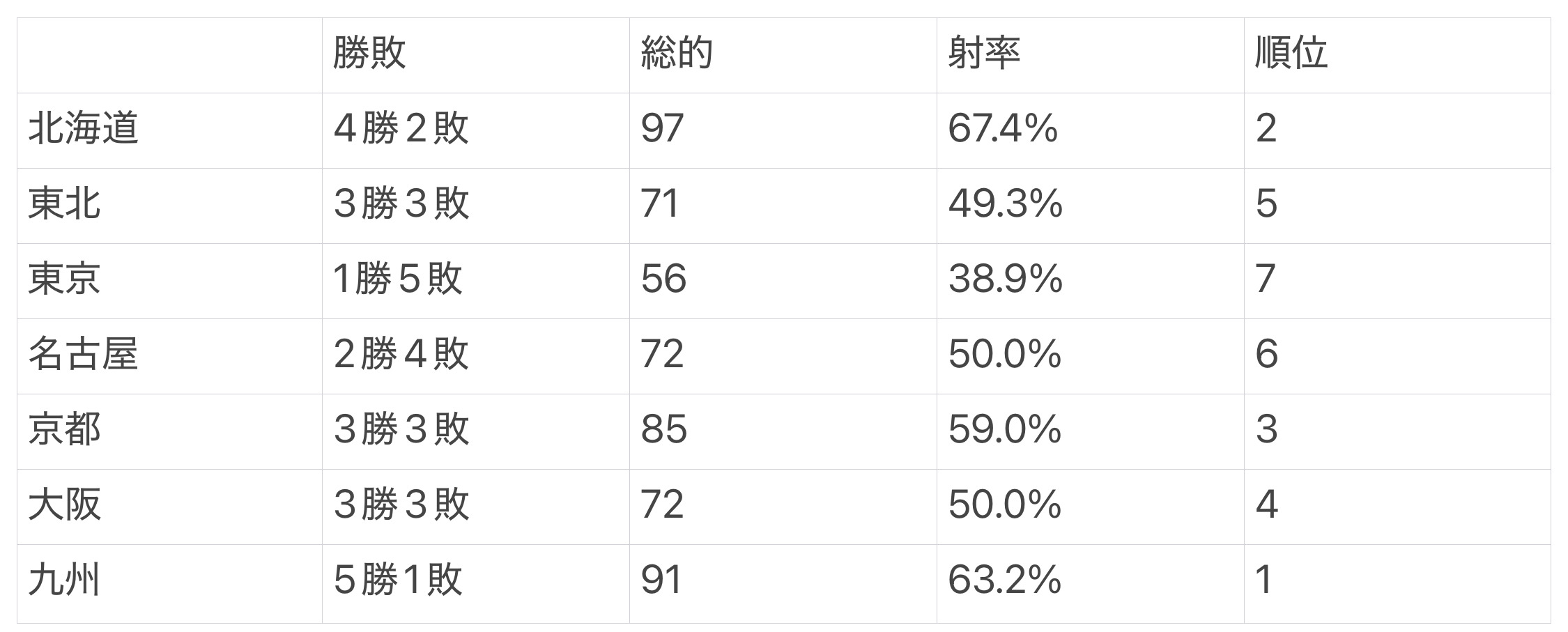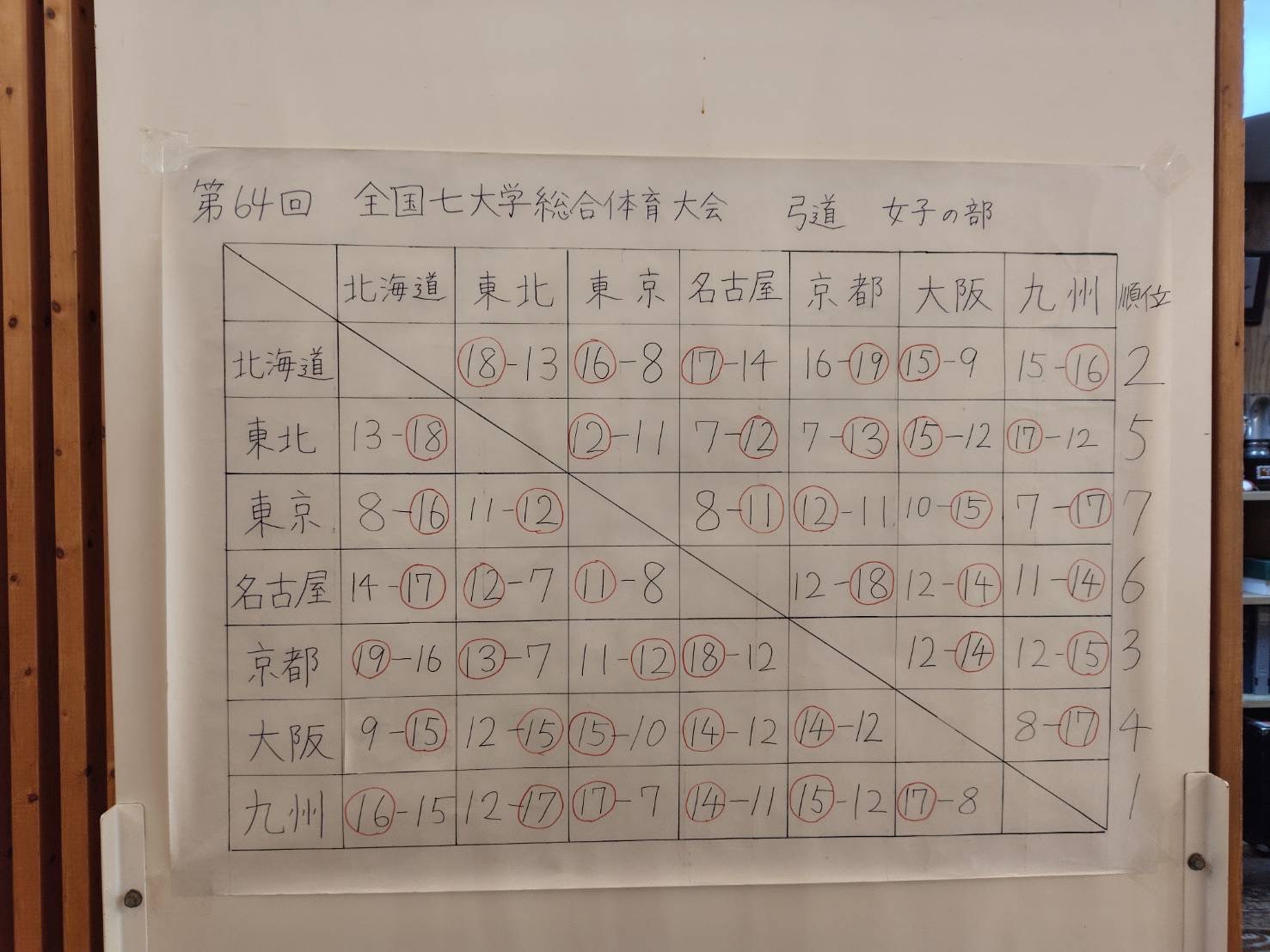 リーグ戦勝敗表と、各大学の成績のまとめを添付しますのでご参照ください。個人成績を含めた詳細の結果は、九州大学弓道部のホームページに掲載されていますので、下記のURLから参照をしてください。