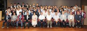 九州大学愛媛同窓会の幹事団は、加藤弘正会長のもと、おそろいの法被を着て、プログラム立案から当日の会場設営、受付、運営まで裏方として汗を流しました。みなさん、お疲れ様でした。