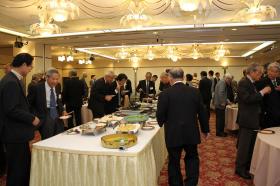 ~第二部終了後は会場を移し、進行も清丸泰司事務局長代理(平成2年卒)に変わり、第三部の懇親会が開演。冒頭、同窓会連合会山縣代表理事からのメッセージを披露した後、85歳になられる棚倉亨先輩(昭和27年卒)による元気あふれる開会のご挨拶に続き、ご来賓として、それぞれ大学・本部から児玉名誉教授、東京より籾井勝人支部長(NHK会長・昭和40年卒)、福岡より貫正義会長兼支部長(前掲)、最後に法学部の徳永幸彦関西支部長からご挨拶をいただいた後、再び貫正義同窓会長のご発声による乾杯で歓談に移りました。