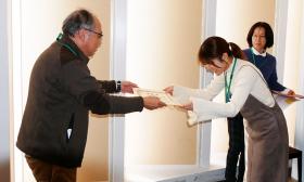 理学部同窓会会長の中條信成先生(生物平成3年卒)より、表彰状と記念品(各受賞者の名前が刻印されたボールペン)が授与されたのち、会食をしながら懇談を行いました。