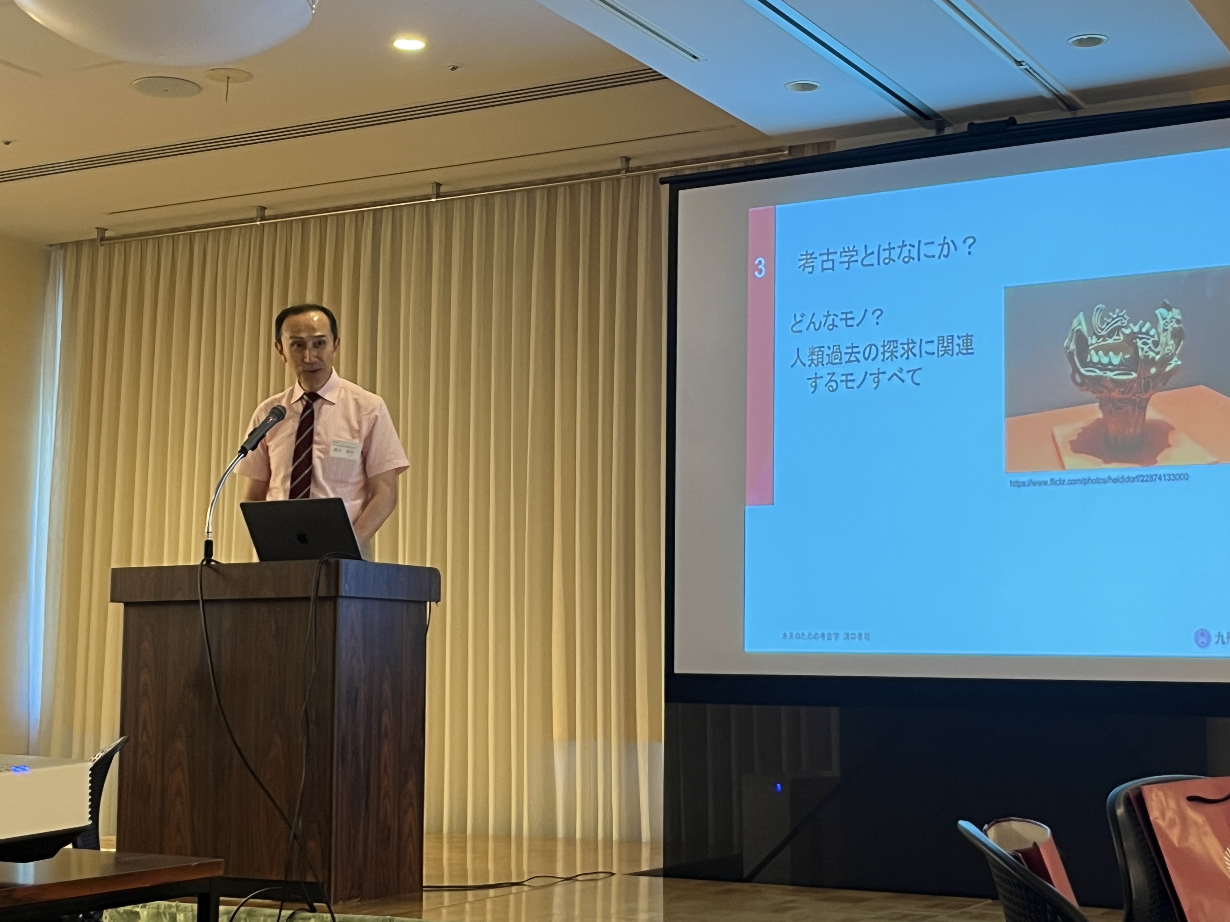 第1部の講演会では、九大大学院比較社会文化研究院教授の溝口孝司氏が「未来のための考古学」と題して、①弥生時代北部九州の甕棺墓地から読み解く社会とその変容、②古墳時代のはじまりと社会の変化を考古学から読み解く、③ショッピングモールの考古学から読み解く今日の社会、最後にまとめとして、考古学的な「温故知新」へと締めくくられました。参加者は真剣な眼差しで先生のお話に聴き入っていました。