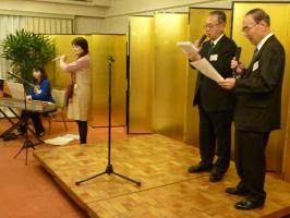 懇親会では会員ご令室によるフルートとピアノのミニコンサートを催し、出席者全員で学友歌「松原に」を合唱します。
