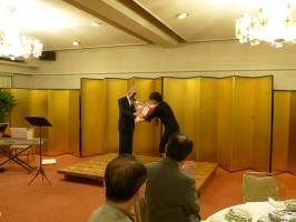 懇親会の冒頭は、みやま市初の名誉市民となられた横倉弘吉氏(当会顧問・S17医学部卒)の受賞を祝して花束が贈呈されました。プレゼンターは吉冨ゆき子さん(H4工学部卒)に務めてもらいました。