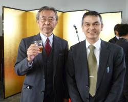式典の後の懇談会は、同じ建物(アイスクエア)のロビーで催され、有川総長の少し砕けたご挨拶の後、田中健蔵元総長の乾杯の音頭で幕を開けました。