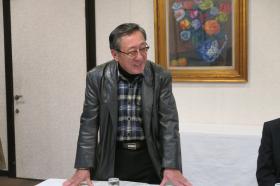 泉会長挨拶(この後退任され顧問推戴・名誉顧問称号奉呈)、右は今回会長に選出された蓮尾勇次副会長