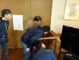 DIY作品の見学会では、石田先生がお孫さんの入学祝いに作られた勉強机をひっくり返して見学する熱の入れよう。田邊先生が屋上に作られた物干し台は「4人乗っても大丈夫っ!」。スゴ過ぎですDIY愛好会。